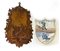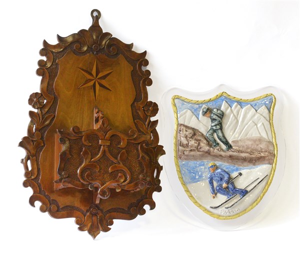 Lotto composto da una placca in maiolica raffigurante alpinista e sciatore e un portaoggetti pensile in legno intagliato (lievi difetti)