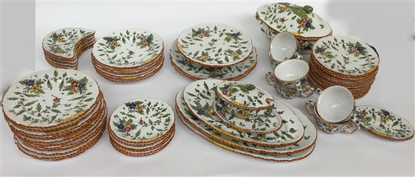 Manifattura di Faenza-Gatti R. Servizio da tavola in ceramica policroma con decoro floreale composto da: una zuppiera, un'alzata portafrutta, una salsiera con piattino, cinque piatti da portata di forma diversa, otto antipastiere, 12 piatti piani, 6 piatti fondi, 12 piatti da dessert, 6 tazze da brodo con piattini