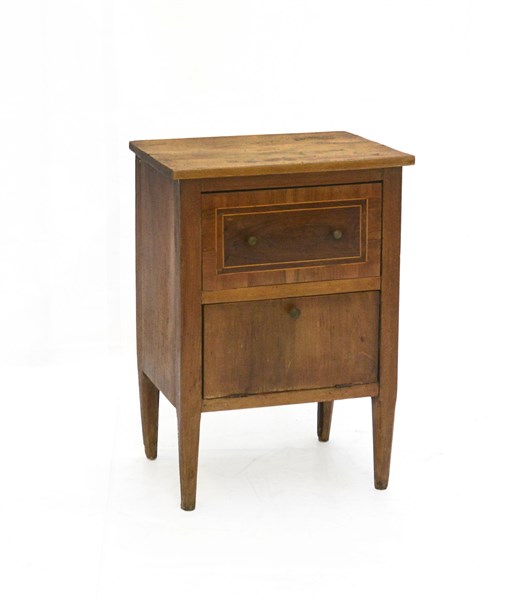 Comoda in noce ad un cassetto filettato ed un anta. Gambe rastremate, secolo XVIII (cm 55x80x40) (difetti e restauri)