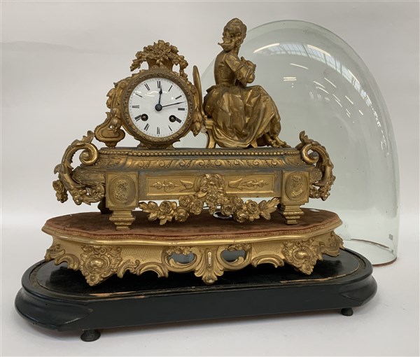 Pendola da tavolo in metallo dorato con basamento in legno intagliato e dorato