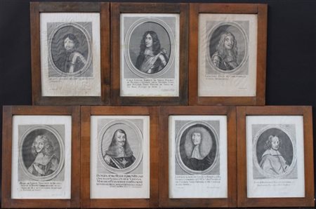 Lotto di sette incisioni a bulino in cornice raffiguranti vari personaggi storici.