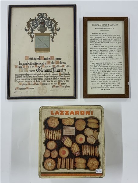 Lotto composta da scatola contenente lettere provenienti dal fronte della Prima Guerra Mondiale. molte su cartoline del Regio esercito, un documento miniato dell'istituto del nastro azzurro sul conferimento del valor militare emesso a Roma nel 1930 e ordine originale del comando del genio dell'ottava armata del 4 novembre 1918. (difetti)