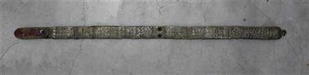 Cintura in cuoio completamente ricoperta di scaglie di metallo bianco sbalzate a motivi geometrici più chiusura centrale arricchita da cabochon.