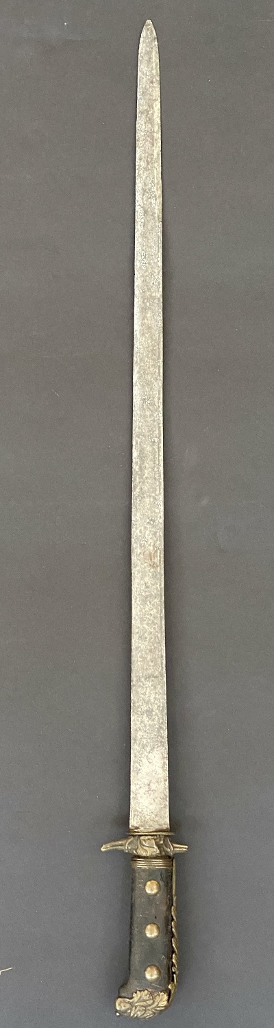 Spada da caccia con impugnatura in legno ricoperta di cuoio con fianco e terminale a testa felina in bronzo. Innesto con figure di animali in bronzo.