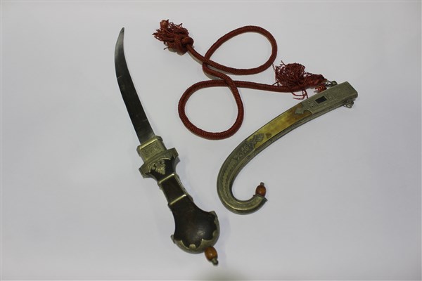 Kumja con fodero con parti in osso e parti in metallo finemente incisi a motivi geometrici con impugnatura a legno di palma. Bottone di codolo con oliva d'ambra.