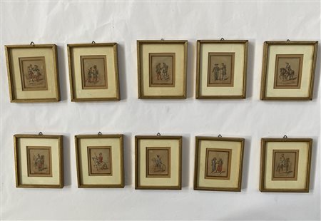 Lotto di dieci piccole incisioni acquerellate raffiguranti le varie tipologie d