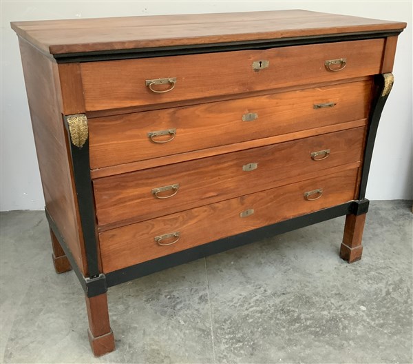 Comò a quatto cassetti con lesene e modanature in legno ebanizzato, piedi a plinto. Secolo XIX (cm 119x98x60) (difetti e restauri)