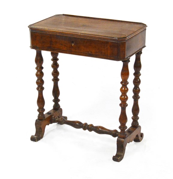 Tavolino da lavoro con cassetto nella nella fascia, gambe tornite e unite da traversa, sec. XIX (cm 59x71x39) (difetti e mancanze)