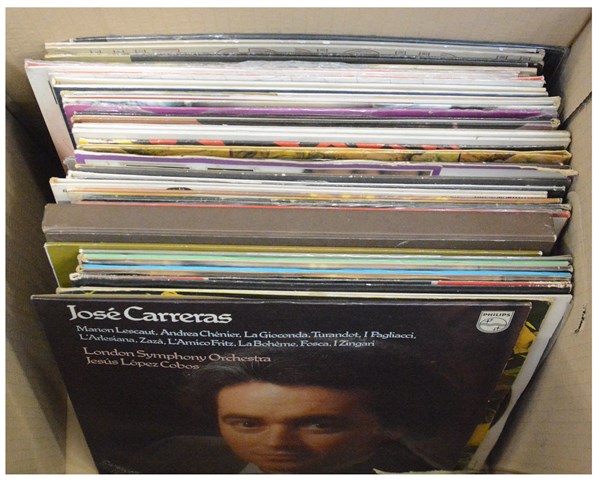 Cartone contenente numerosi vinili 33 giri di generi musicali differenti (lievi