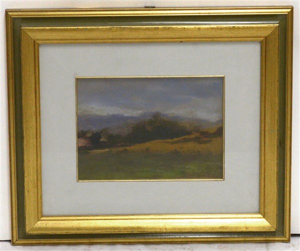 "Paesaggio collinare" olio su masonite (cm 20x28) Firamto in basso a destra. Al retro: timbro dell'Atelier del pittore. In cornice