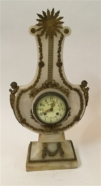 Pendola da tavolo in alabastro a forma di lira decorata con applicazioni in metallo dorato a fiori, nastri, rosoni; angioletti a tutto tondo sui lati. Movimento modificato a bilancere, con suoneria delle ore su campanello. Quadrante in smalto con numeri arabi decorato a fiorellini. Misura h. cm 58. Base quadrata in onice . (gravi difetti)