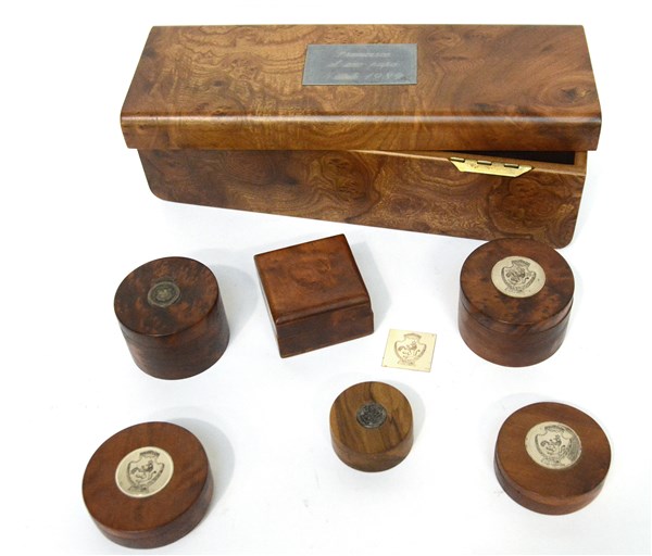 Lotto composto da una scatola rettangolare in radica e sei tabacchiere in legno