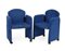 Coppia di poltrone imbottite rivestite in velluto sintetico blu a rotelle. Ital