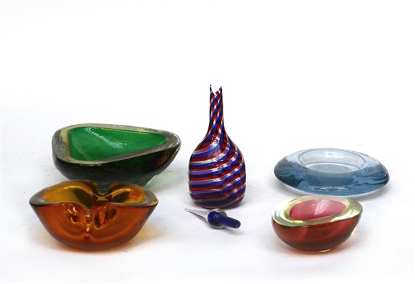 Lotto composto da quattro posacenere in vetro massello di diversi colori uniti a una bottiglia con tappo in vetro soffiato spiraliforme trasparente, blu rosso. Murano, produzione recente. (misure diverse) (difetti)