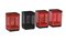 Lotto composto da quattro cestini in metallo traforato rosso e nero e plastica. Produzione Neolt, Italia, anni duemila. Marcato sotto la base. (cm 23,5x34x24) (difetti)