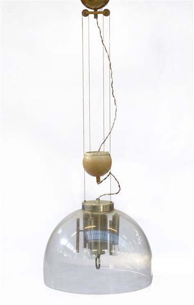Lampada a saliscendi con calotta in plexiglass e supporto in ottone. Italia, an