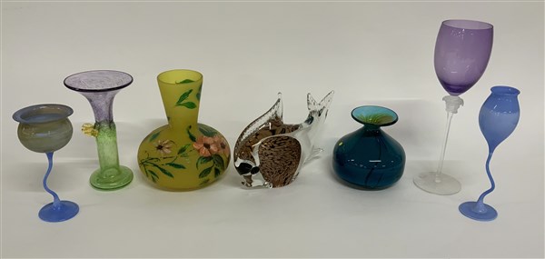 Lotto composto da tre vasetti, tre bicchieri a stelo ed una scultura raffigurante un pesce in vetro e cristallo di diversa forma e decoro. Secolo XX. (misure diverse)