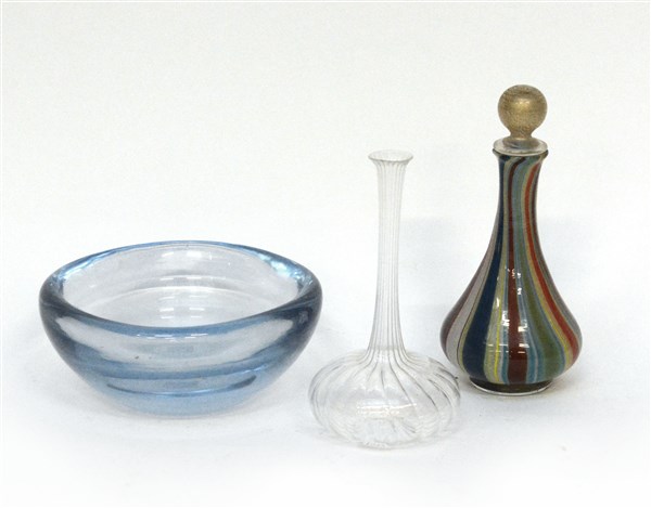 Lotto composto da un ciotola in vetro massello trasparente azzurrino di forte spessore unita a una bottiglia con tappo in vetro soffiato a canne policrome e un vasetto soliflore in vetro soffiato costolato incolore. Murano, seconda metà secolo XX. (Misure diverse) (lievi difetti)