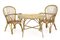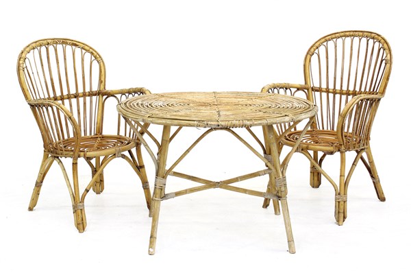 Fornitura da veranda composta da un tavolo con piano ovale e due poltroncine in giunco e malacca. Italia, anni '60. (tavolo cm 94x63x75; poltroncine cm 60x90x75) (difetti)