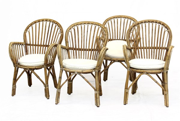 Lotto 2665 | Lotto composto da quattro poltroncine in giunco e malacca con cuscini imbottiti