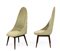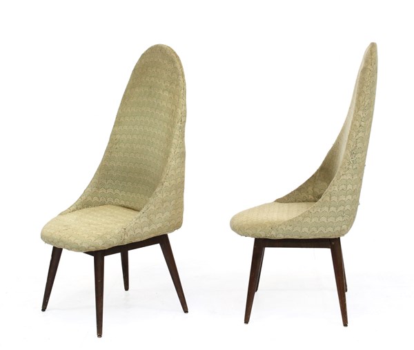 Coppia di poltroncine a conca con gambe troncoconiche in legno di mogano e seduta e schienale imbottiti e rivestiti in tessuto. Italia, anni '50. (cm 51x114x67) (difetti)