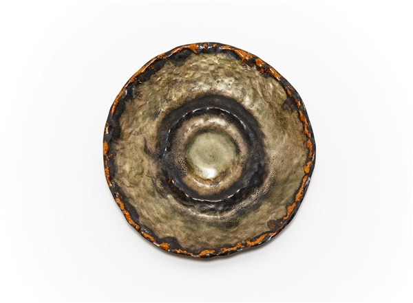 Piatto decorativo in rame martellato e smaltato in policromia, etichetta al verso della XXXII Biennale Internazionale di Venezia, 1964. (d cm 41) (lievi difetti)