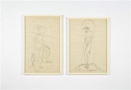 Lotto di due bozzetti per decorazioni scultoree raffiguranti nudi di figure femminili. Grafite su carta. La Spezia, anni '20/'30. Firmati A. Magli (cm 65.5x41; cm 62.5x44). In cornice.
