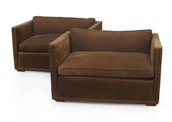 Coppia di divanetti imbottiti a pozzetto con rivestimento in velluto marrone. Italia, anni '80/'90. (cm 122x69x85) (difetti)