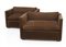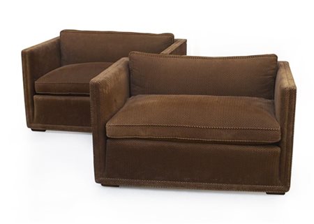Coppia di divanetti imbottiti a pozzetto con rivestimento in velluto marrone. I