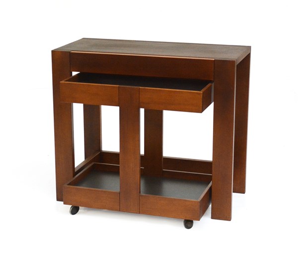 Banco in legno di teak massello, impiallacciato e verniciato con carrellino. Italia, anni '70/'80. (cm 93x80x43) (lievi difetti)