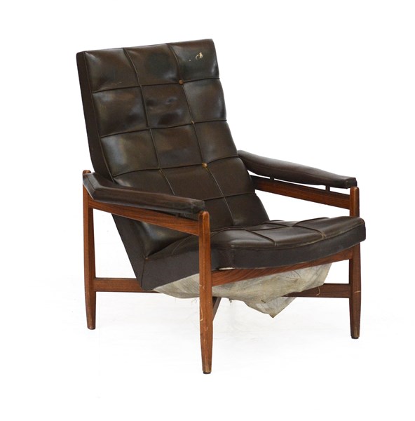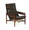 Poltrona con struttura in palissandro indiano massello, seduta e braccioli imbottiti e rivestiti in skai marrone. Italia, anni '60. (cm 77x95x80) (difetti e piccole mancanze)