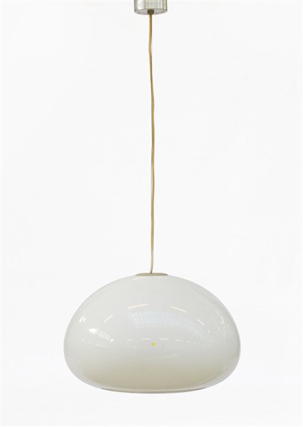 Lampada a sospensione modello "Black and white". Produzione Flos, Milano, anni '60. Paralume in vetro soffiato lattimo e struttura in alluminio. (h cm 127; d cm 50) (lievi difetti)