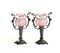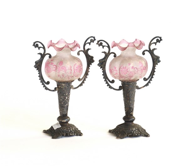 Coppia di vasi portafiore in vetro su sostegno biansato cesellato in argento. Anni '20. (difetti)