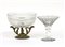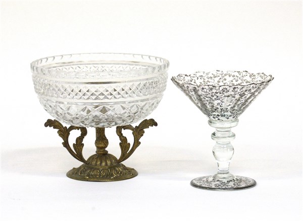 Lotto composto da un bicchiere in vetro cristallo con decorazioni floreali in foglia d'argento alla base e alla coppa e un'alzatina con base in fusione di metallo dorato e coppa in vetro cristallo stampato. Secolo XX. (h cm 17, h cm 18,5 e d cm 22)