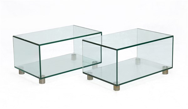 Lotto di due tavolini da salotto con piano in cristallo e piedini in metallo. I