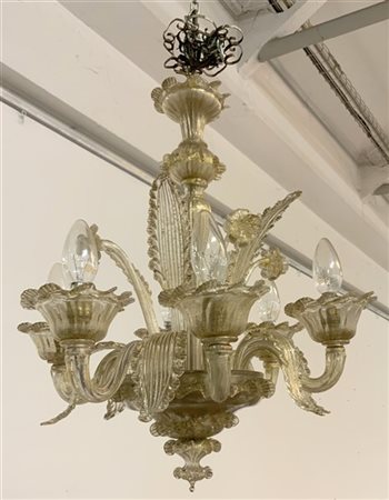 Piccolo lampadario a sei luci con inserti a fiori e foglie in vetro soffiato incolore con applicazione di foglia d'oro. Italia, secolo XX. (h cm 45) (lievi difetti e mancanze)