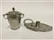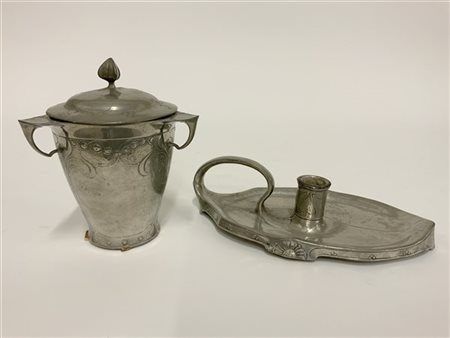Lotto composto da un'urna triansata modello 4334 e da una bugia modello 4384 in fusione metallica nichelata. Krefeld, inizio secolo XX. Marcate sotto la base. (urna h cm 17; bugia cm 26x7x16) (lievi difetti)