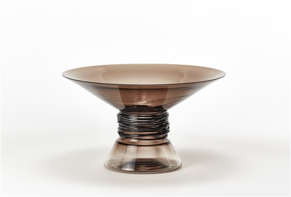 Alzata in vetro soffiato trasparente ametista, fusto decorato con fili ametista