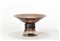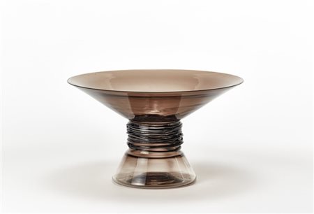 Alzata in vetro soffiato trasparente ametista, fusto decorato con fili ametista applicati a caldo. Seconda metà secolo XX. (h cm 20; d cm 34,5)