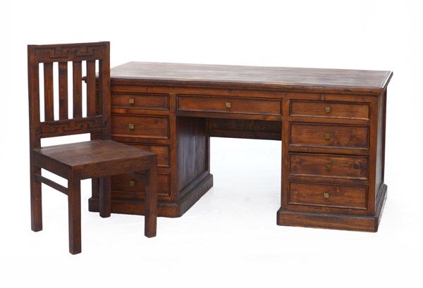 Scrivania in noce massello a nove cassetti con una sedia ensuite, pomelli dei c