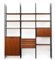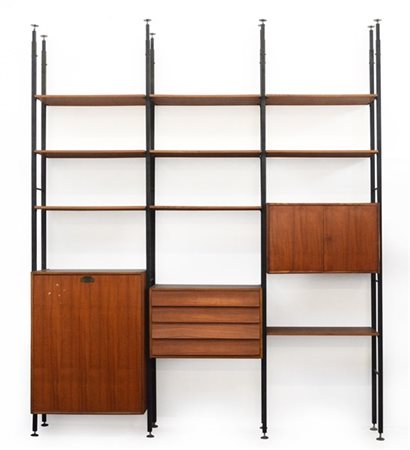 Libreria a tre campate con montanti regolabili a puntone in metallo verniciato nero, uno stipo contenente un letto a ribalta, nove ripiani, uno stipo a due ante, uno stipo a quattro cassetti e un piccolo stipo a due ante in legno impiallacciato e bordato. Italia, anni '60. (cm 252x300x40) (lievi difetti e piccole modifiche )