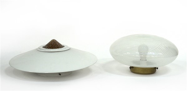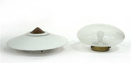 Lotto composto da una plafoniera con struttura in metallo verniciato bianco e paralume in vetro di Murano incamiciato lattimo e a murrine marroni e bianche e una plafoniera con paralume ovoidale in vetro soffiato incolore a reticello lattimo. Anni '70. (d cm 50; d cm 40) (lievi difetti)