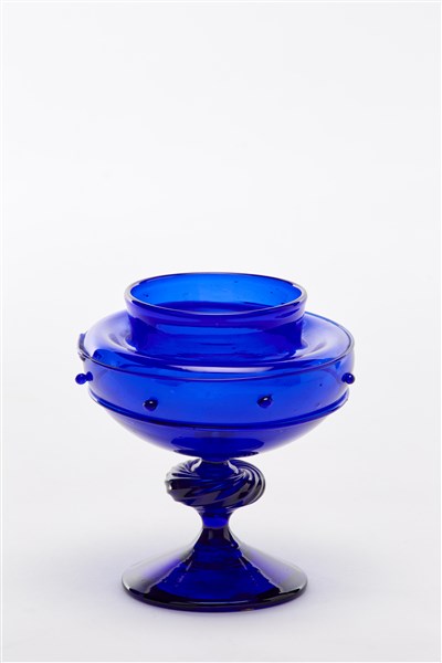 Coppetta in vetro soffiato trasparente blu, con fili e bugne applicate a caldo. Murano, anni '10/'20. (h cm 11)