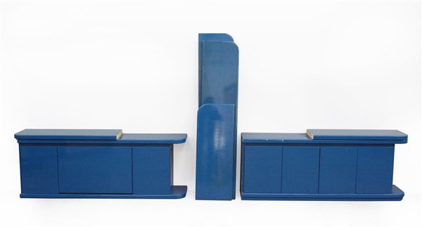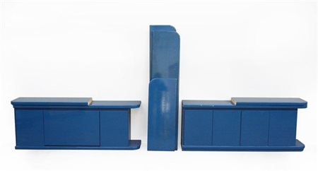 Parti di libreria in truciolato laccato color blu cina unito a otto mensole di medesima fattura. Italia, secolo XX. (Misure diverse) (lievi difetti)