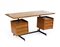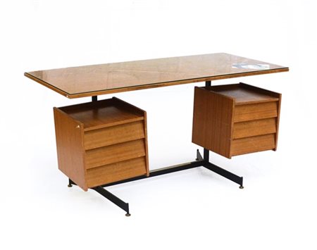 Scrivania con struttura in metallo verniciato nero, stipi a tre cassetti e piano impiallacciato in teak. Italia, anni '60. (cm 150x77x70) (difetti)