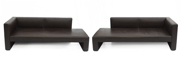 Coppia di divani a due posti rivestiti in eco pelle marrone. Produzione Matteo Grassi, Italia, anni duemila. (cm 190x64,5x88) (lievi difetti)