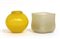 Lotto composto da un vaso di forma sferoidale in vetro pulegoso giallino con bocca applicata e inclusione di foglia d'oro, firmato e datato "Bisazza vetro 1993" sotto la base e un vaso di forma parallelepipeda in vetro incolore a macchie lattimo. Italia, anni '90. (h cm 16,5 e cm 15x15x15)