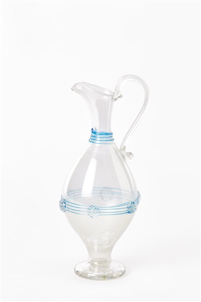 Piccolo versatoio in vetro soffiato incolore iridato, presa ricurva, bugne e fili vitrei azzurri applicati a caldo. Murano, anni '20ca. (h cm 21,5)