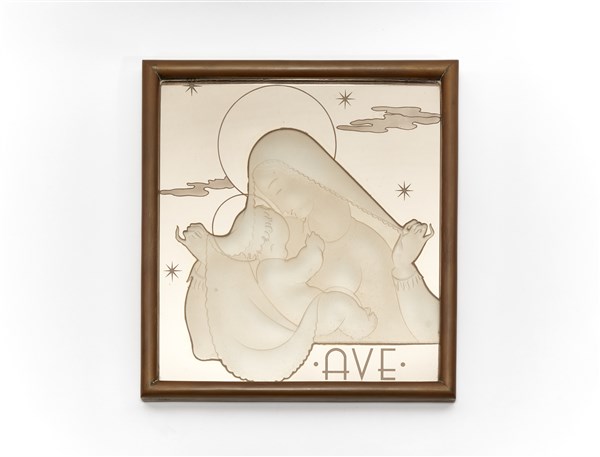 Pannello decorato con figura di Madonna e Bambino. Produzione, Milano, anni '30. Cristallo rosambrato specchiato, inciso a getto di sabbia. (cm 39x41). Cornice in legno e ottone. (lievi difetti)