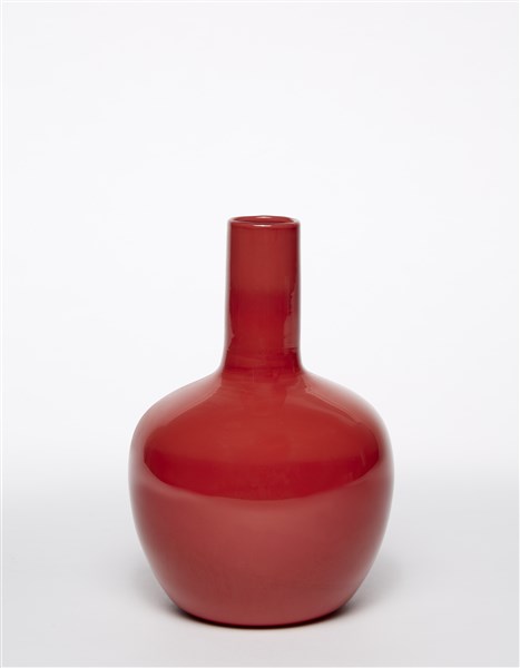 Vaso a bottiglia della serie "Cinesi". Murano, anni '60/'70. Vetro incamiciato rosso opaco. Modello 513.0 del "catalogo verde", firmato a punta sotto la base "Venini Italia". (h cm 24; d cm 15)